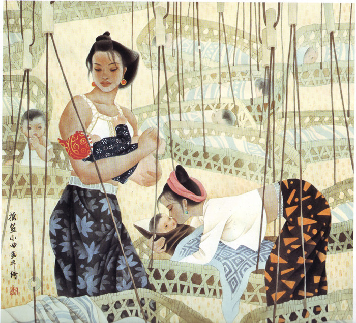 1978年,卢平进入四川美术学院,师从萧建初、冯建吴、李文信等名家,是卢平艺术观念系统化的关键时期。学院教育使她工笔、水墨、花鸟、人物兼修,实现了技法上的全面储备。其毕业创作《摇篮小曲》等被中国美术馆收藏,则标志着其艺术语言的初步成熟:在扎实的工笔功底之上,融入了浓郁的生活气息与抒情性笔调。这一时期,卢平确立了她艺术生涯的第一阶段——一种以写实造型为基础,充满温情与诗意的现实主义风格。